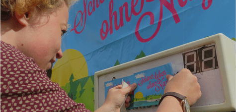 Unsere Stände eignen sich gut, um sie in ein bestehendes, öffentliches Veranstaltungsformat einzubinden – zum Beispiel einen Aktionstag, ein Festival oder ein Sommerfest.. Wir bieten Mitmach-Aktionen an, wie etwa ein Glücksrad mit Quizfragen, Sprühkreide oder eine Fotowand. Wir haben tolle Gewinne mit unserem Schöner leben ohne Nazis-Slogan dabei und kommen gern mit den Menschen vor Ort ins Gespräch. Unsere Angebote richten sich an Jugendliche und junge Erwachsene im Alter von 14 Jahren bis Mitte 20.